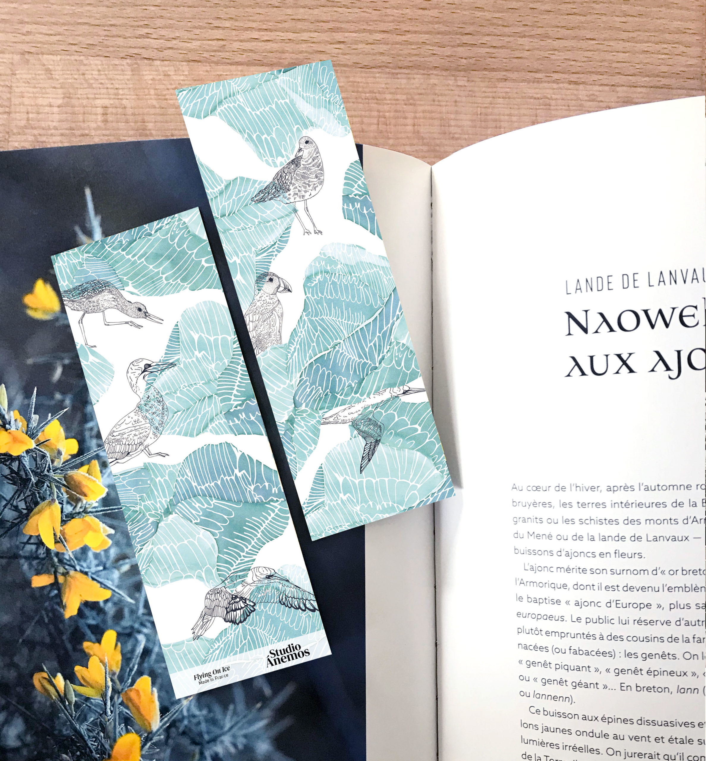 Marque-page de 5cm par 14,5cm au motif recto verso. « Flying On Ice » est imprimé sur un papier « soft touch » qui donne un aspect d’un velours doux et mat.